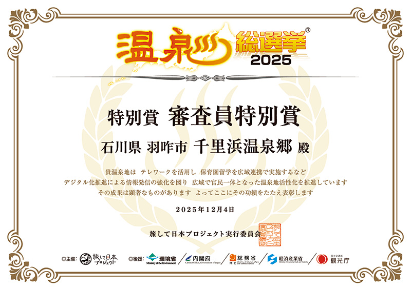 このたび、全国の温泉地を対象に、皆さまの応援投票をもとにランキングを発表する「温泉総選挙2025」において、ちりはま ホテルゆ華のある石川県・千里浜温泉郷が、「美肌部門」第2位(北陸エリア)、ならびに「審査委員特別賞」を受賞しました。